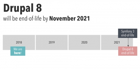 ​一方、Drupal 8 からDrupal 9 へのバージョンアップは比較的容易だという話です。 Drupal 9 がリリースされてから 移行する。というのも 一つの考えですが、Drupal 9 が(Contribute moduleも含め)安定してから 移行するとなると 大規模なサイトでは時間が足りない可能性があります。