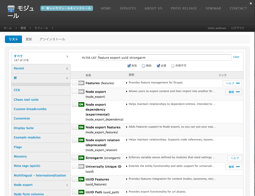 ※ UUIDモジュール、UUID Featuresモジュールも同時に有効にします。 - Strongramモジュールを有効にすることにより、変数(Variable)の移行ができるようになります。
