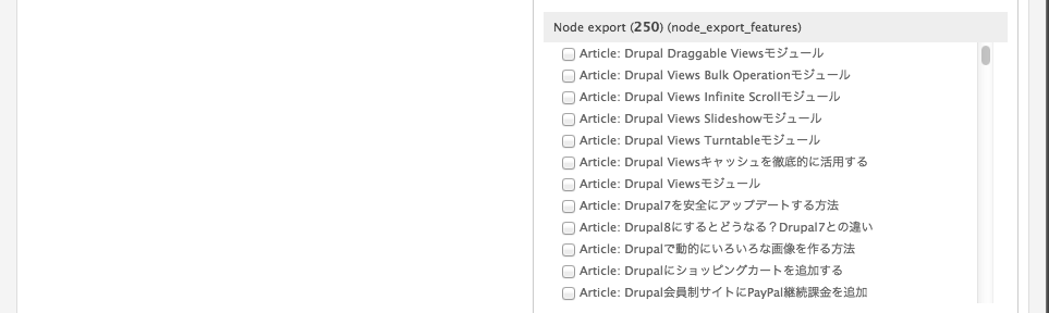 Node Exportモジュールをインストールすることにより、開発用サイト側では下記のように移行対象のノードが選択できるようになります。