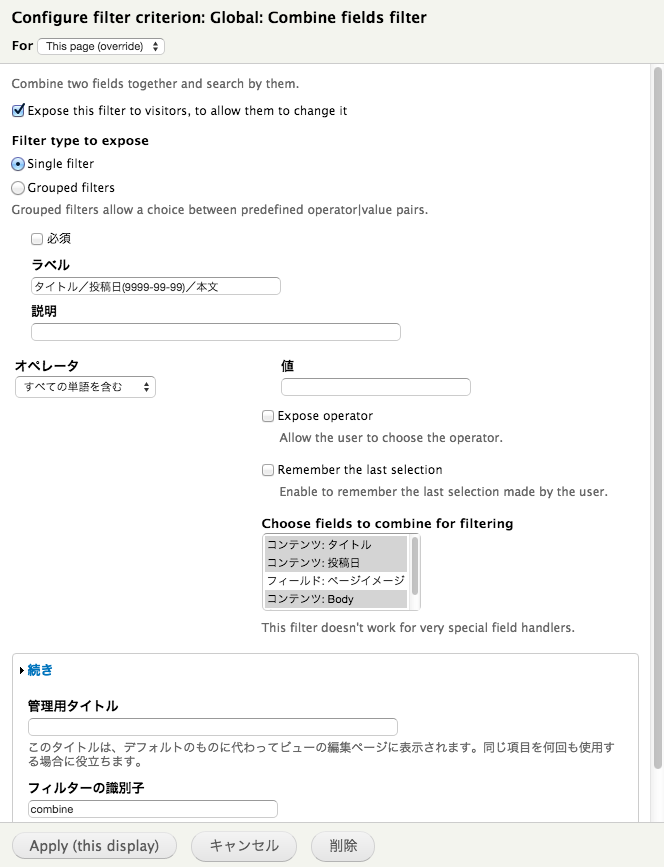 • 「Apply (this display)」をクリックし、「Configure filter criterion: Global: Combine fields filter」ダイアログへ。
