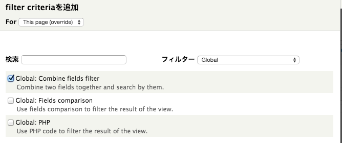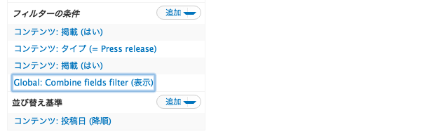 • 再びViews設定ページで上記のように「Global: Combile fields filter(表示)」が追加されていることを確認。